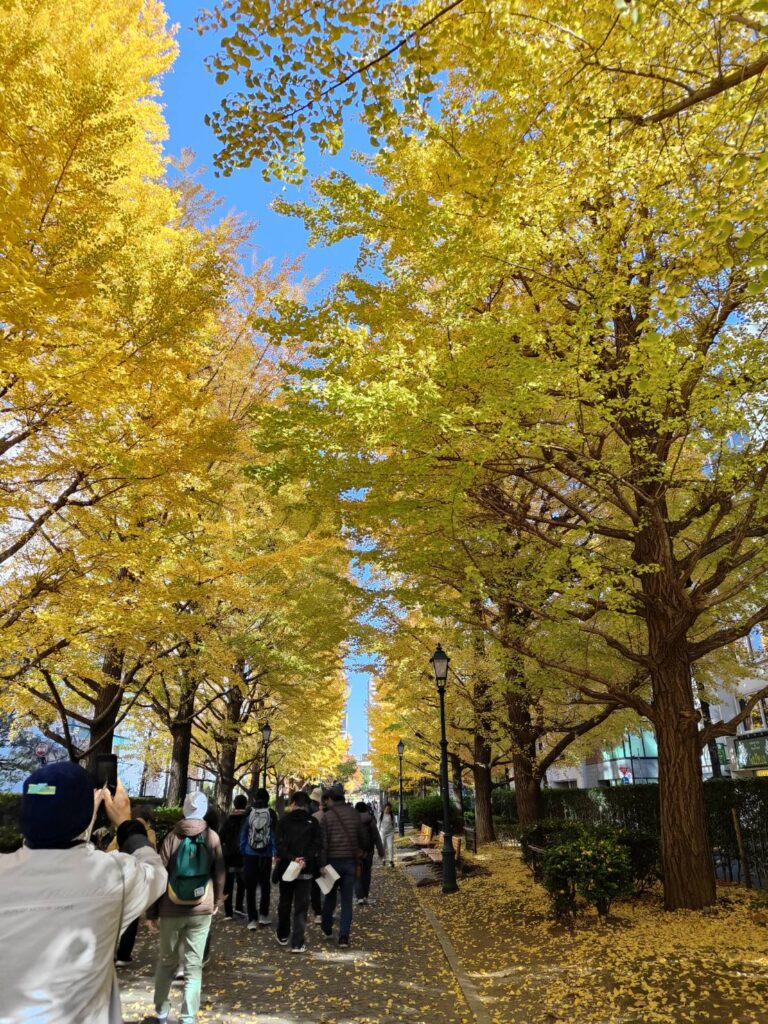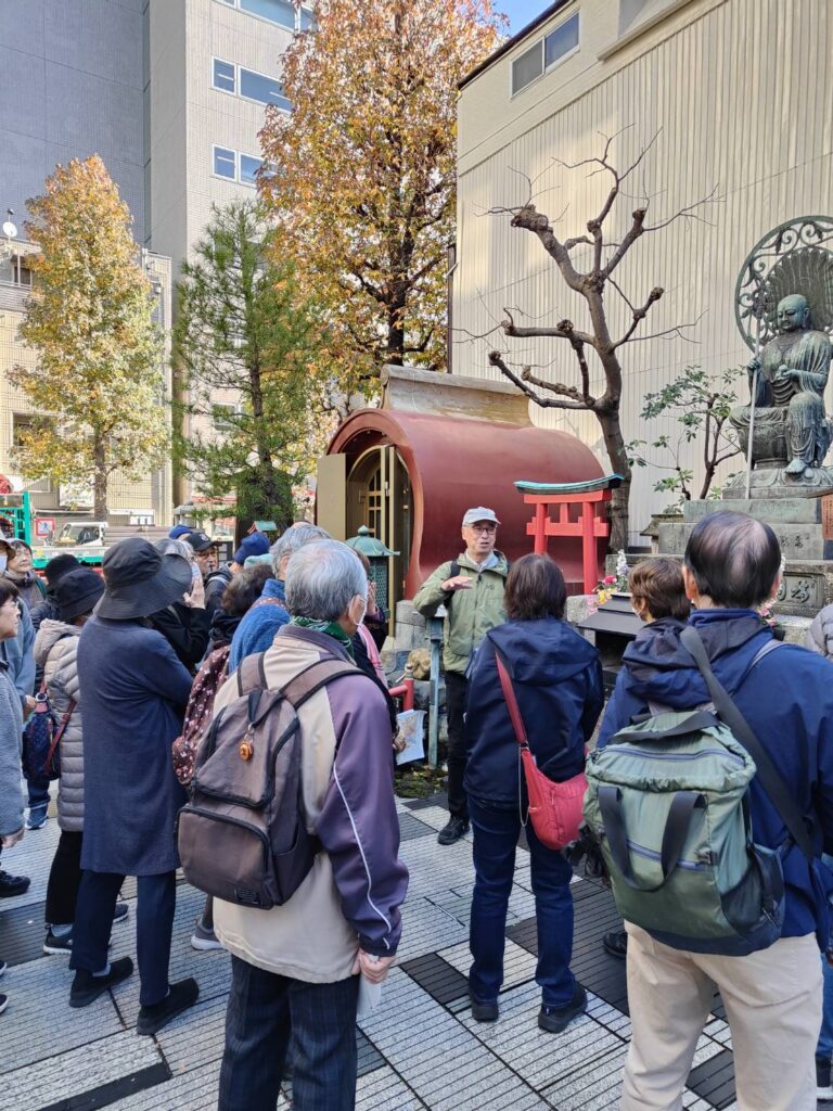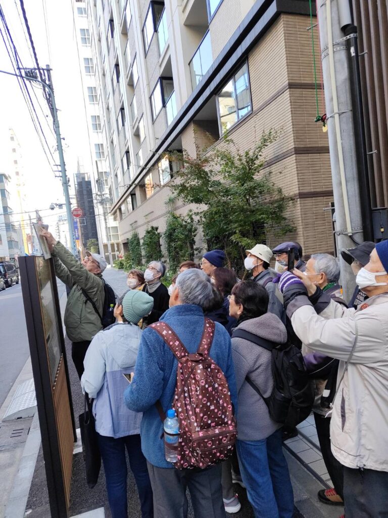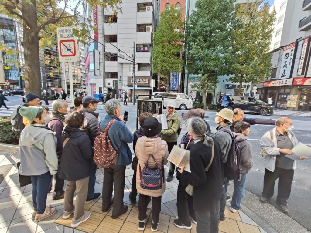 11月26日(水)の散策はお天気にも恵まれ紅葉の日本橋界隈を講師の山本先生の名説明で古地図と現代地図を比較しながら2時間半かけて歩きました。